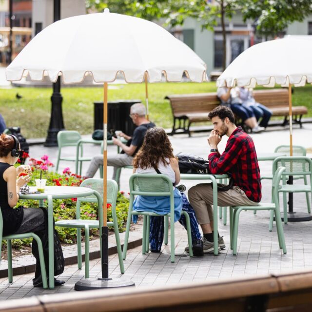 Downtown Montreal recently enhanced Dorchester Square with new features to energize this iconic space. The improvements include 50 tables, 100 chairs, and 50 umbrellas, offering visitors and downtown workers a welcoming place to relax.